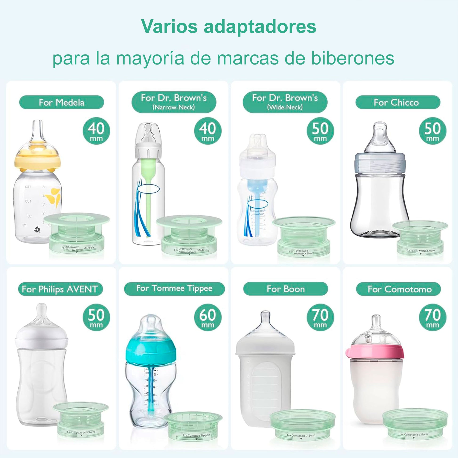 - Incluye 5 adaptadores para las principales marcas de biberones. 01 se adaptan a Philip Avent/ Chicco 02 se adaptan a Tommee Tippee 03 se adaptan a Comotomo / Boon 04 se adapta a Dr. Brown’s Narrow 40mm / Medala 40mm 05 adaptar a Dr. Brown’s Wide-Neck 50mm